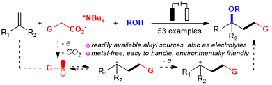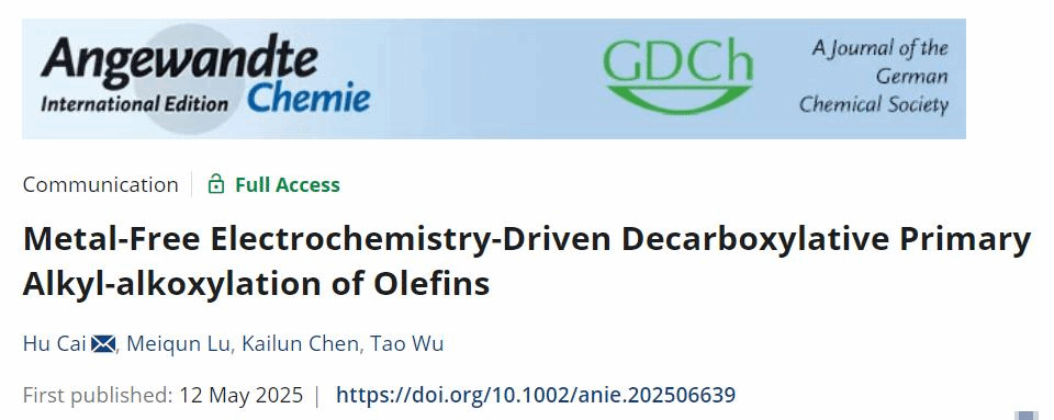 本網訊(化學化工學院)近日,我校化學化工學院蔡琥教授團隊和吳濤教授課題組在電化學有機合成領域取得新進展,創新性地開發了一種電化學驅動的無需金屬催化劑和傳統氧化劑參與的烯烴伯烷基-烷氧基化反應,研究成果以“Metal-Free Electrochemistry-Driven Decarboxylative Primary Alkyl-alkoxylation of Olefins”為題發表在Angewandte Chemie International Edition上。我校化學化工學院陸美群博士為該論文第一作者,蔡琥教授和吳濤教授為共同通訊作者,南昌大學為第一署名單位和通訊單位。