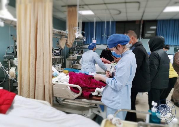 春節(jié)大量外出人員的回歸增加了大量發(fā)熱病人的預(yù)檢分診,分診護(hù)士仔細(xì)為病人測(cè)量生命體征,記錄信息,指引發(fā)熱患者前往發(fā)熱門診就診,疏散普通急診病人,一絲不茍、高度嚴(yán)謹(jǐn)?shù)刈龊靡咔榉雷o(hù)工作。在忙碌的搶救室,下級(jí)醫(yī)院轉(zhuǎn)上來的危重病人一個(gè)接著一個(gè),搶救室的護(hù)士們打起十二分精神全力以赴,醫(yī)護(hù)合作默切地處理每一個(gè)危重癥患者。每個(gè)區(qū)域各司其職,擰成一股繩,堅(jiān)守在抗疫、急救的最前線。