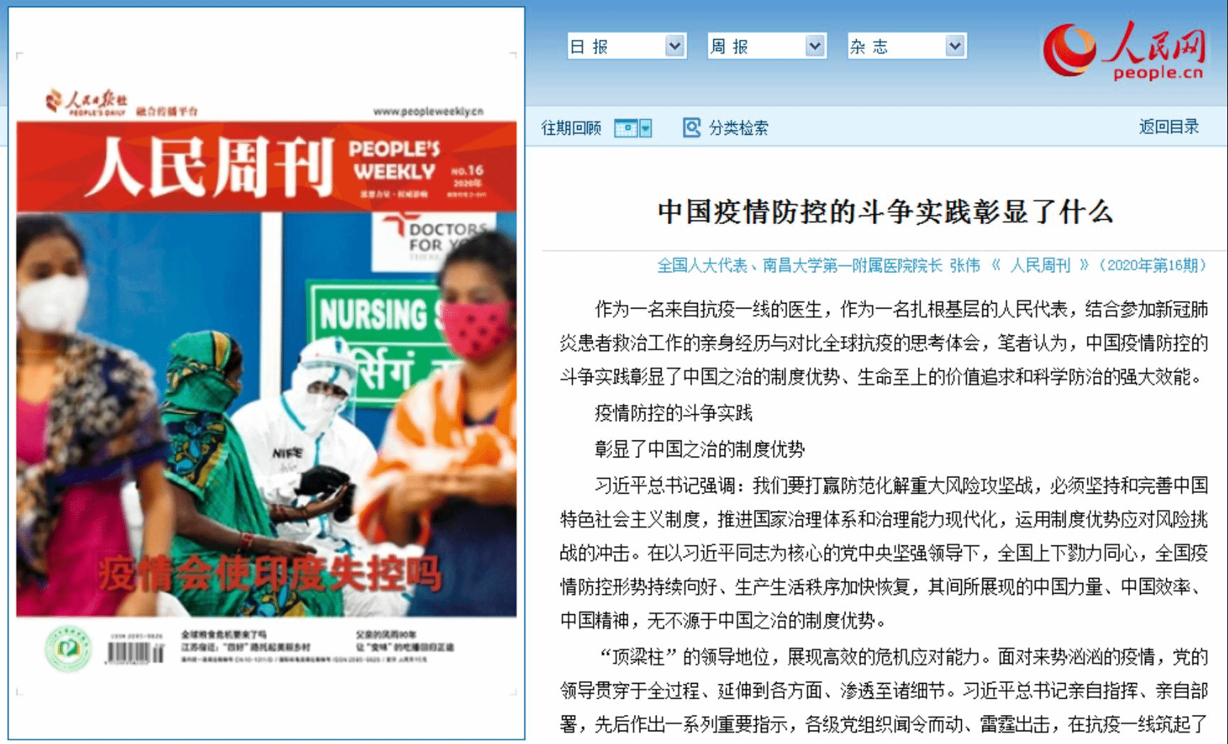 編者按近日,人民日?qǐng)?bào)社旗下的《人民周刊》在第16期刊載我校第一附屬醫(yī)院院長張偉署名文章《中國疫情防控的斗爭實(shí)踐彰顯了什么》,文章結(jié)合張偉自身參加新冠肺炎患者救治工作的親身經(jīng)歷與對(duì)比全球抗疫的思考體會(huì),闡釋了中國之治的制度優(yōu)勢、生命至上的價(jià)值追求和科學(xué)防治的強(qiáng)大效能。全文如下: